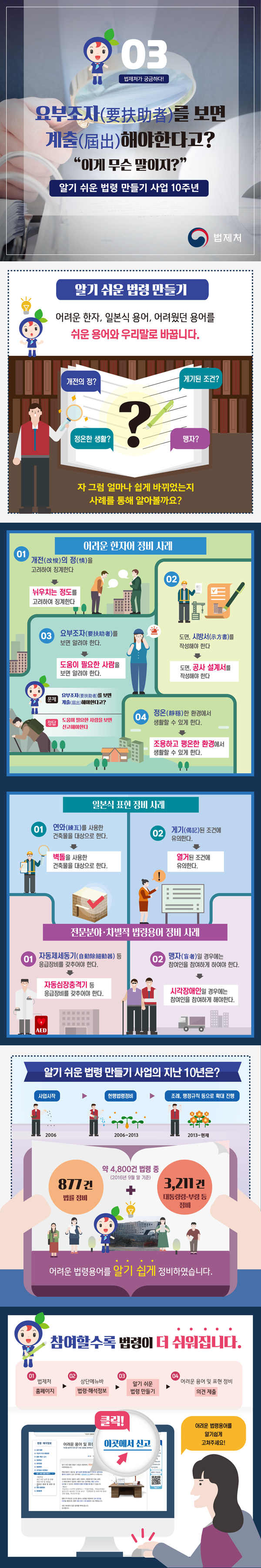 ‘알기 쉬운 법령 만들기’ 사업은 법령을 보다 알기 쉽게 만들어 누구나 쉽게 읽고 잘 이해할 수 있도록 하는 사업으로서 어려운 한자어, 일본식 용어 등을 쉬운 우리말로 바꾸는 용어 정비와, 길고 복잡한 법령 문장을 명확하게 개선하는 문장 정비에 중점을 두고 있습니다.